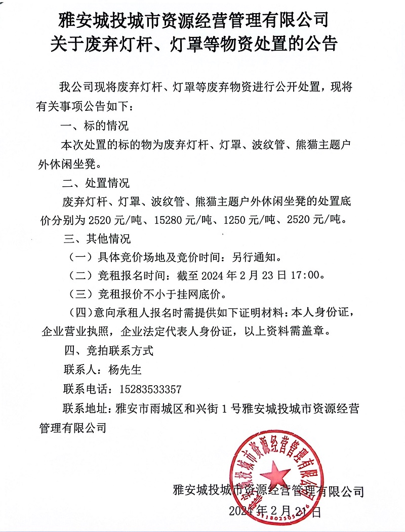雅安城投城市資源經(jīng)營(yíng)管理有限公司關(guān)于廢棄燈桿、燈罩等物資處置的公告
