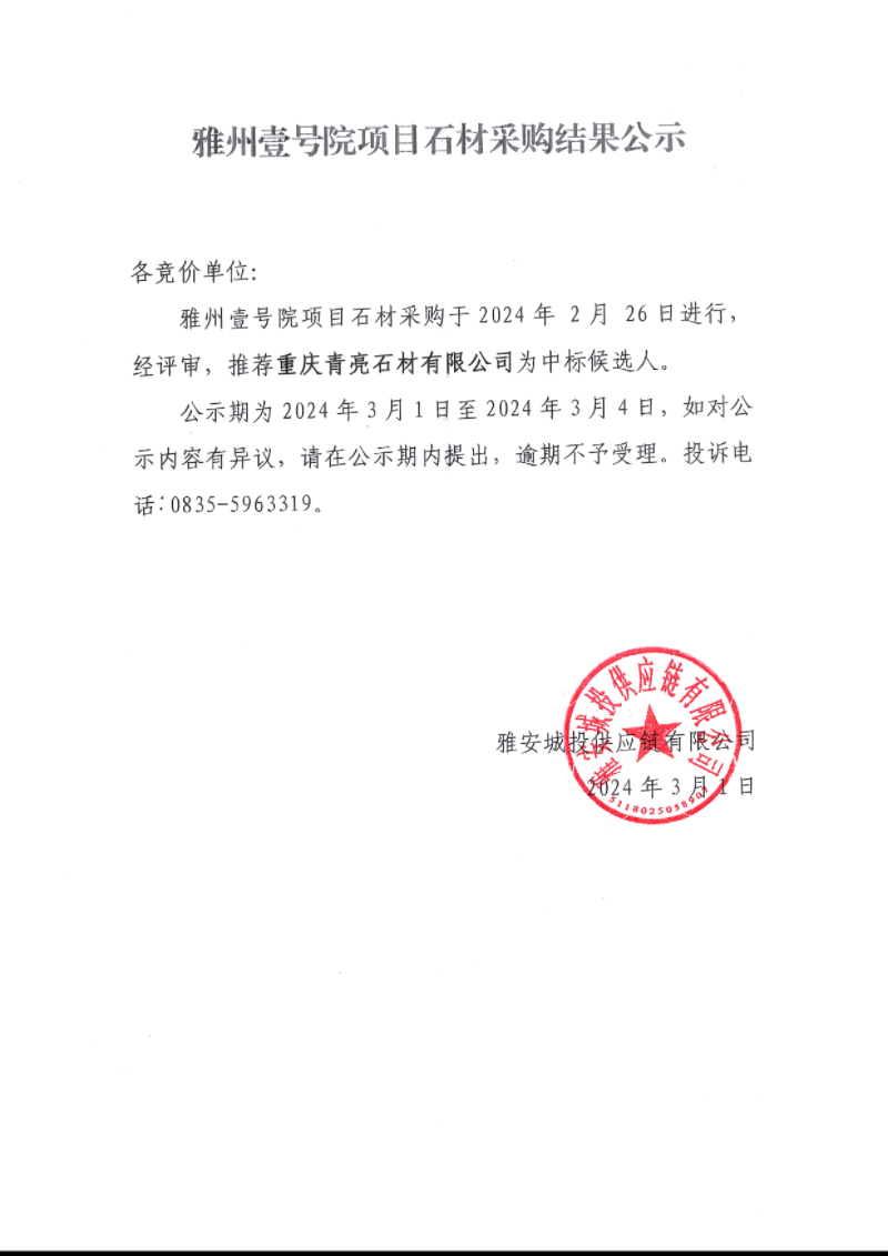 雅州壹號(hào)院項(xiàng)目石材采購(gòu)結(jié)果公示