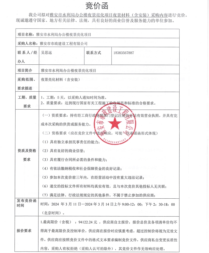 雅安市水利局辦公樓夜景亮化項(xiàng)目夜景材料(含安裝)采購內(nèi)容競(jìng)價(jià)公告