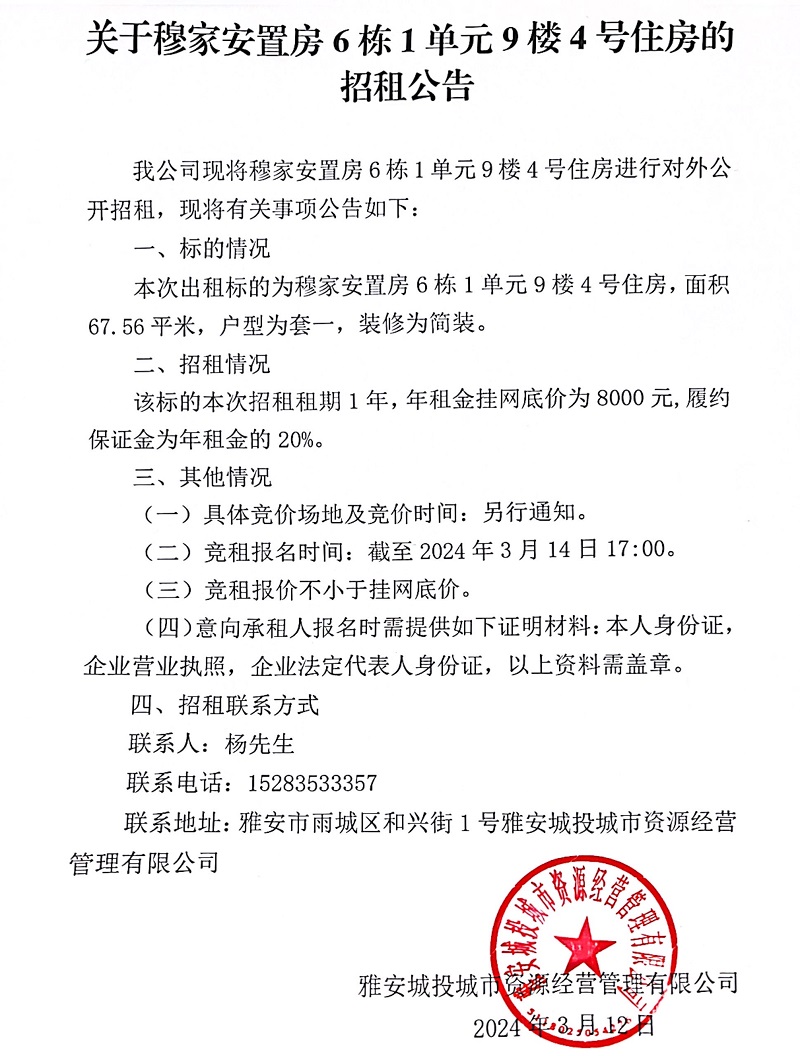 關(guān)于穆家安置房6棟1單元9樓4號住房招租的公告