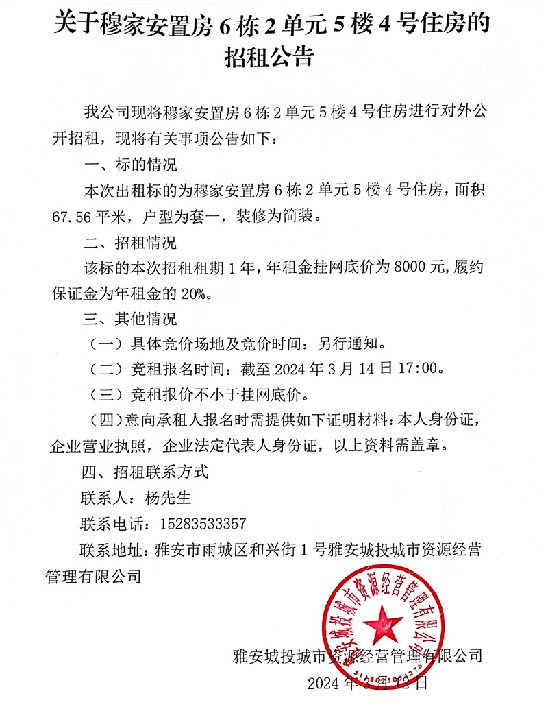 關(guān)于穆家安置房6棟2單元5樓4號(hào)住房的招租公告