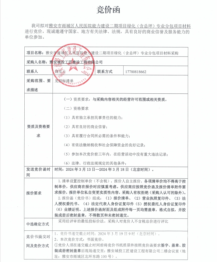雅安市雨城區(qū)人民醫(yī)院能力建設(shè)二期項(xiàng)目綠化(含總坪)專業(yè)分包項(xiàng)目材料采購競(jìng)價(jià)公告