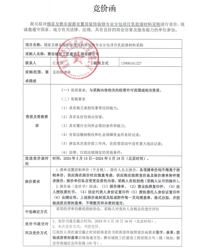 穆家及雅東麗都安置房裝飾裝修專業(yè)分包項(xiàng)目乳膠漆材料采購(gòu)競(jìng)價(jià)公告