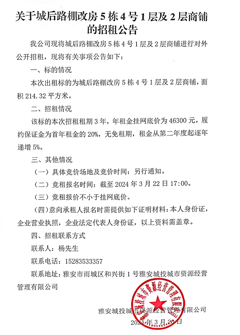關(guān)于城后路棚改房5棟4號1層及2層商鋪的招租公告