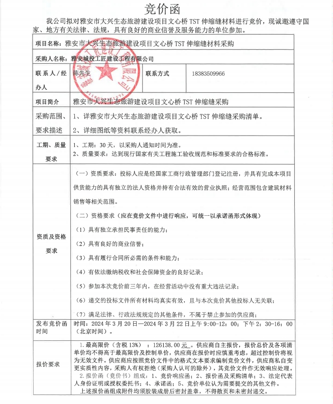 雅安市大興生態(tài)旅游建設(shè)項(xiàng)目文心橋TST橋梁伸縮縫材料采購(gòu)競(jìng)價(jià)公告