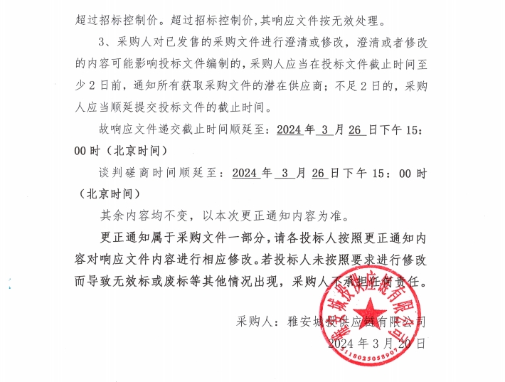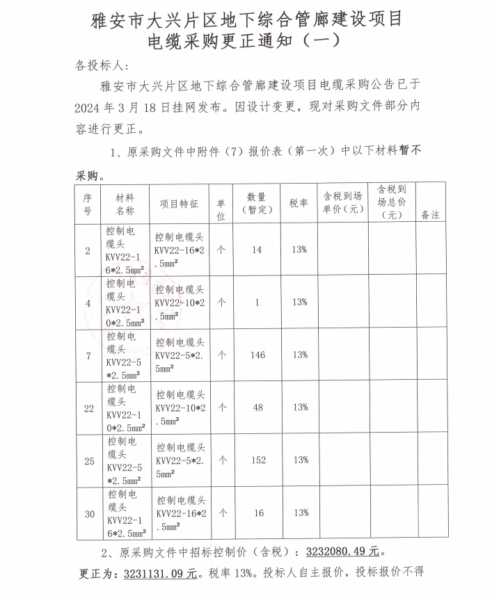 雅安市大興片區(qū)地下綜合管廊建設(shè)項(xiàng)目電纜采購更正通知(一)