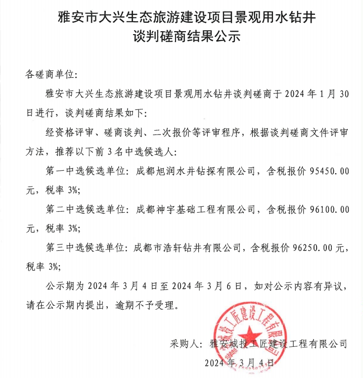雅安市大興生態(tài)旅游建設(shè)項目景觀用水鉆井談判磋商結(jié)果公示