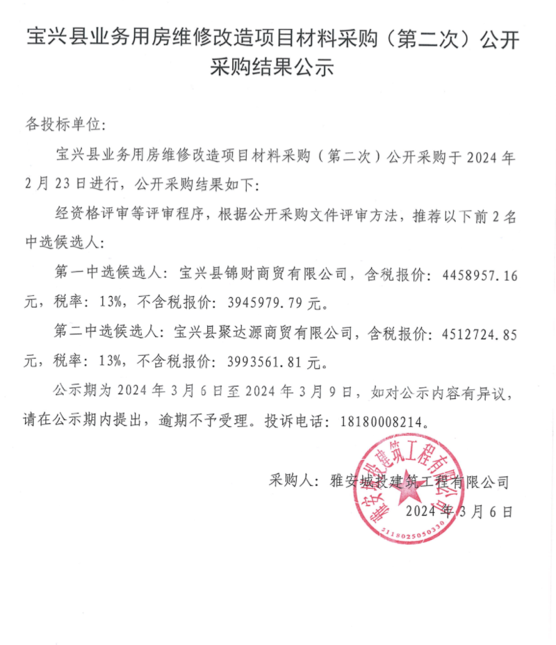 寶興縣業(yè)務(wù)用房維修改造項(xiàng)目材料采購(gòu)(第二次)公開(kāi)采購(gòu)結(jié)果公示
