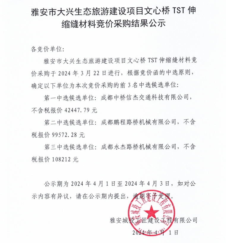 雅安市大興生態(tài)旅游建設項目文心橋TST伸縮縫材料競價采購結(jié)果公示