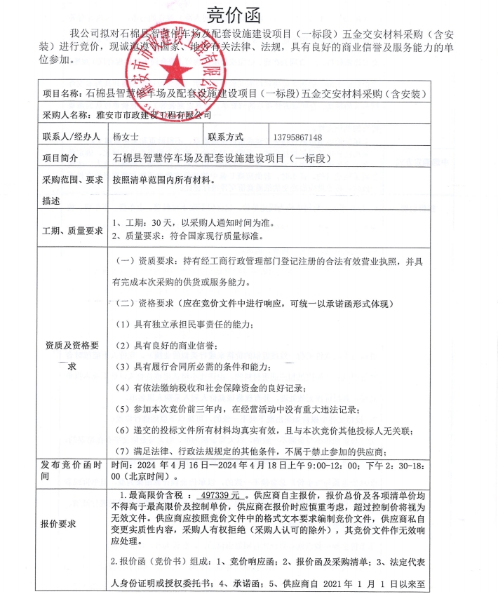 石棉縣智慧停車(chē)場(chǎng)及配套設(shè)施建設(shè)項(xiàng)目(一標(biāo)段)五金交安材料(含安裝)競(jìng)價(jià)公告