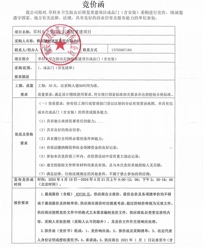 草科鄉(xiāng)衛(wèi)生院災(zāi)后恢復(fù)重建項(xiàng)目成品門(含安裝)采購(gòu)競(jìng)價(jià)公告