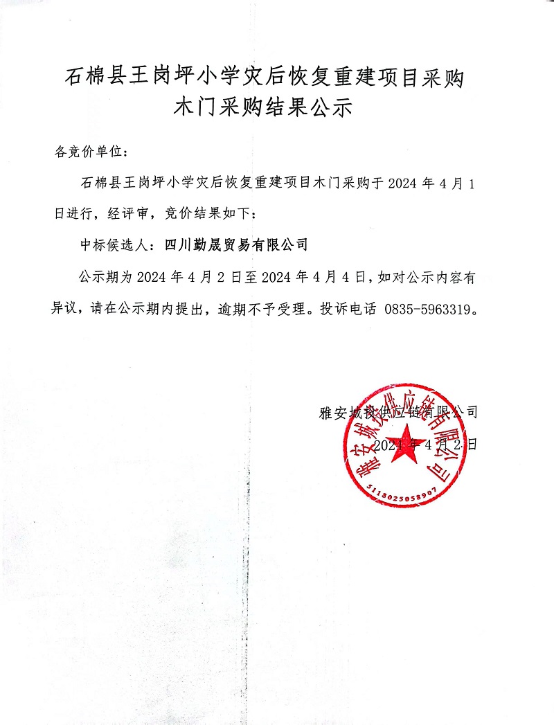 石棉縣王崗坪小學(xué)災(zāi)后恢復(fù)重建項目采購木門采購結(jié)果公示
