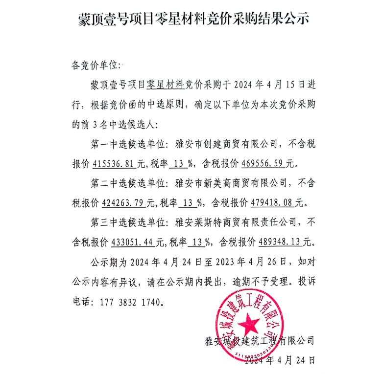 蒙頂壹號項(xiàng)目零星材料競價采購結(jié)果公示