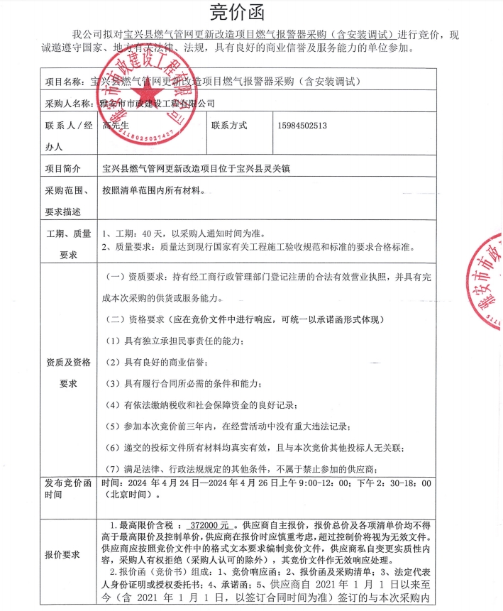 寶興縣燃氣管網更新改造項目燃氣報警器采購(含安裝調試)競價公告