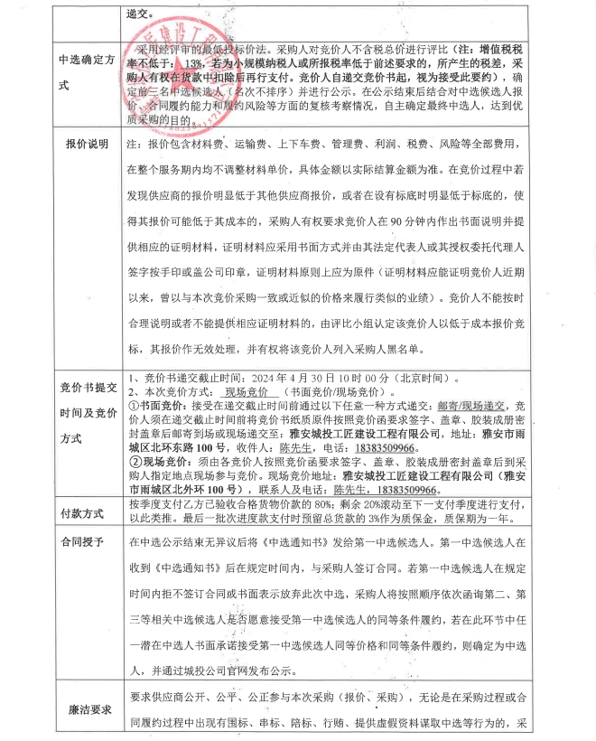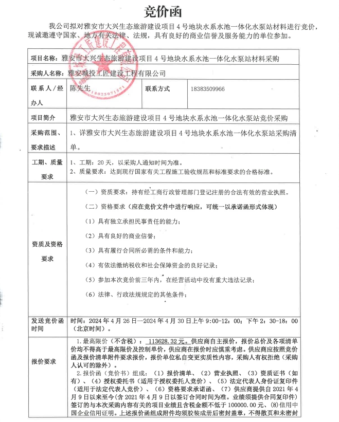 雅安市大興生態(tài)旅游建設(shè)項(xiàng)目4號(hào)地塊水系水池一體化水泵站材料采購競價(jià)公告