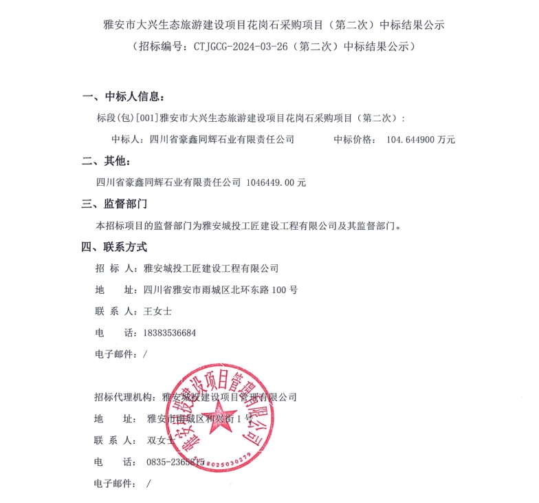 雅安市大興生態(tài)旅游建設(shè)項目花崗石采購項目(第二次)中標(biāo)結(jié)果公示