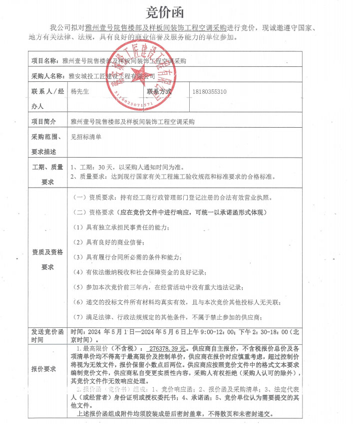 附件:競(jìng)價(jià)函-空調(diào)采購(gòu)-雅州壹號(hào)院售樓部及樣板間