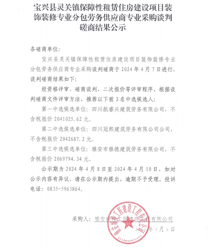 寶興縣靈關(guān)鎮(zhèn)保障性租賃住房建設(shè)項(xiàng)目裝飾裝修專業(yè)分包勞務(wù)供應(yīng)商專業(yè)采購談判磋商結(jié)果公示