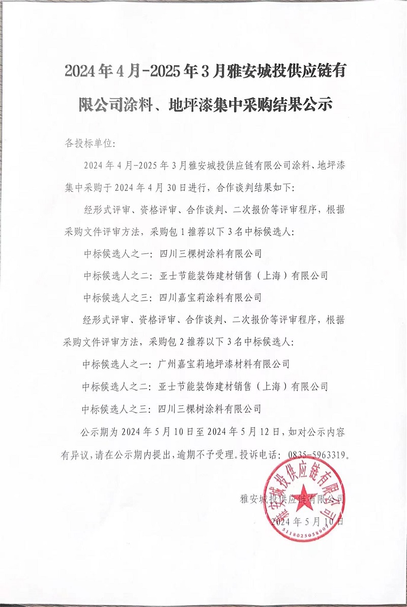 2024年4月-2025年3月雅安城投供應鏈有限公司涂料、地坪漆集中采購結(jié)果公示