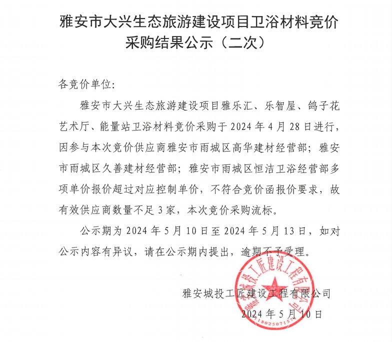 雅安市大興生態(tài)旅游建設(shè)項(xiàng)目衛(wèi)浴材料競價(jià)采購結(jié)果公示(二次)