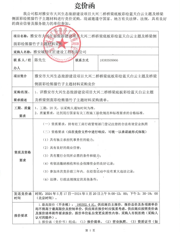 雅安市大興生態(tài)旅游建設(shè)項(xiàng)目大興二橋橋梁底板彩繪藍(lán)天白云主題及橋梁側(cè)面彩繪熊貓竹子主題材料采購(gòu)競(jìng)價(jià)公告