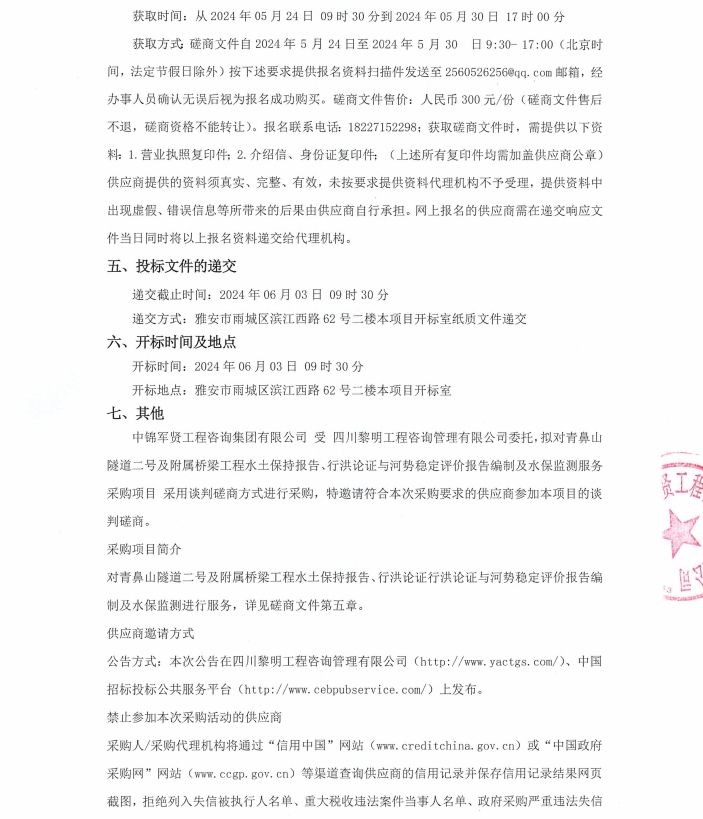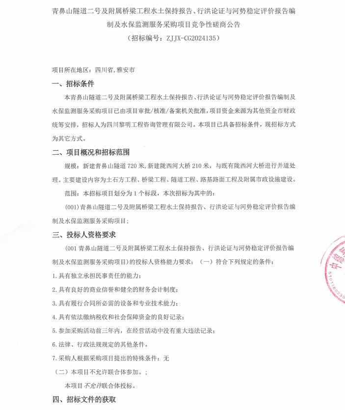 青鼻山隧道二號及附屬橋梁工程水土保持報告、行洪論證與河勢穩(wěn)定評價報告編制及水保監(jiān)測服務(wù)采購項(xiàng)目競爭性磋商公告