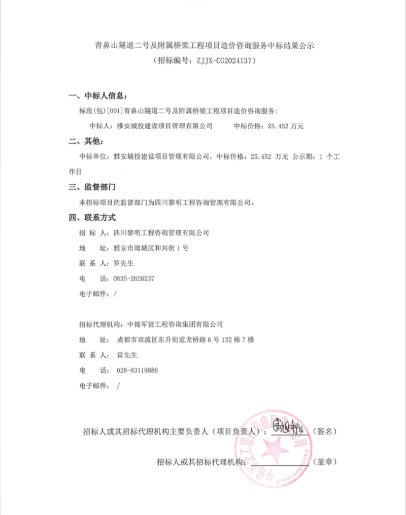 青鼻山隧道二號及附屬橋梁工程項目造價咨詢服務(wù)中標結(jié)果公示
