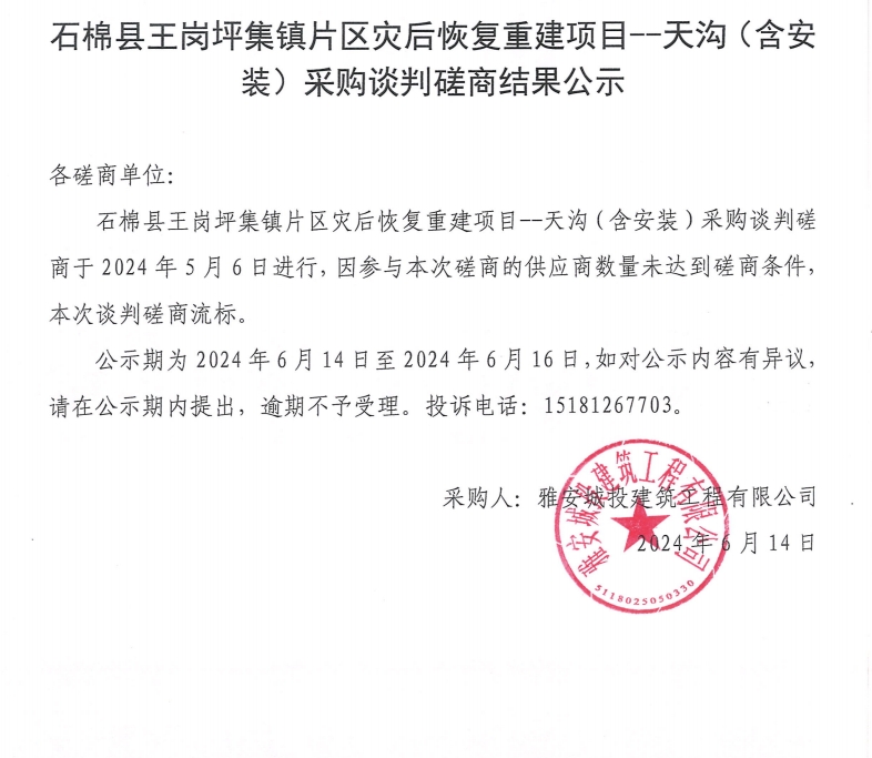 石棉縣王崗坪集鎮(zhèn)片區(qū)災(zāi)后恢復(fù)重建項目--天溝(含安裝)采購談判磋商結(jié)果公示