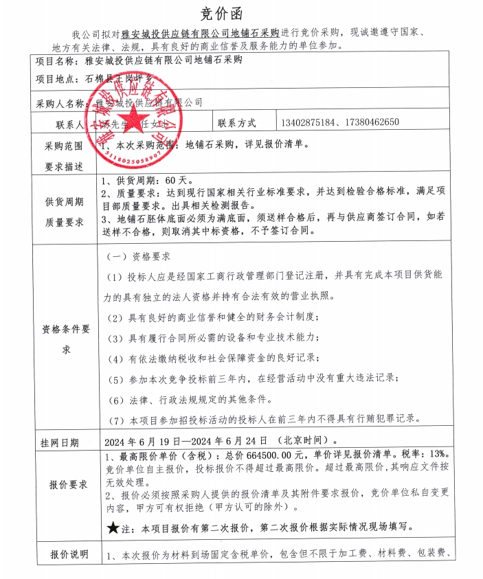 雅安城投供應鏈有限公司地鋪石采購競價公告