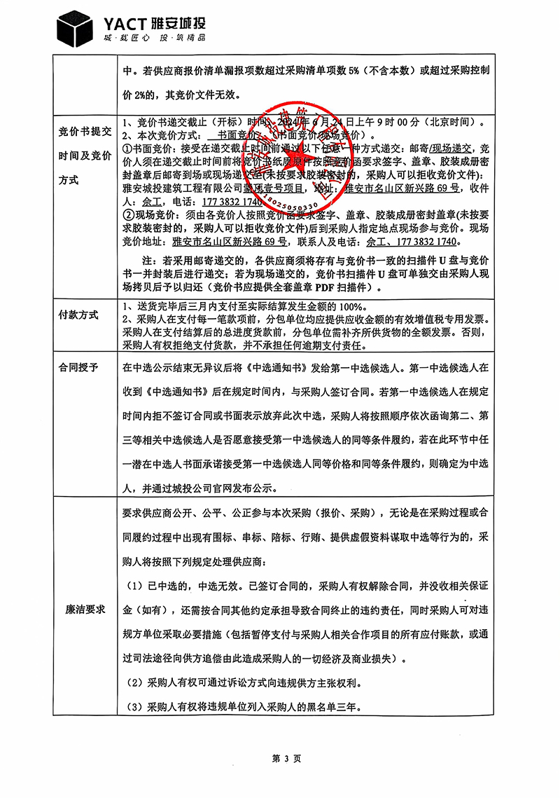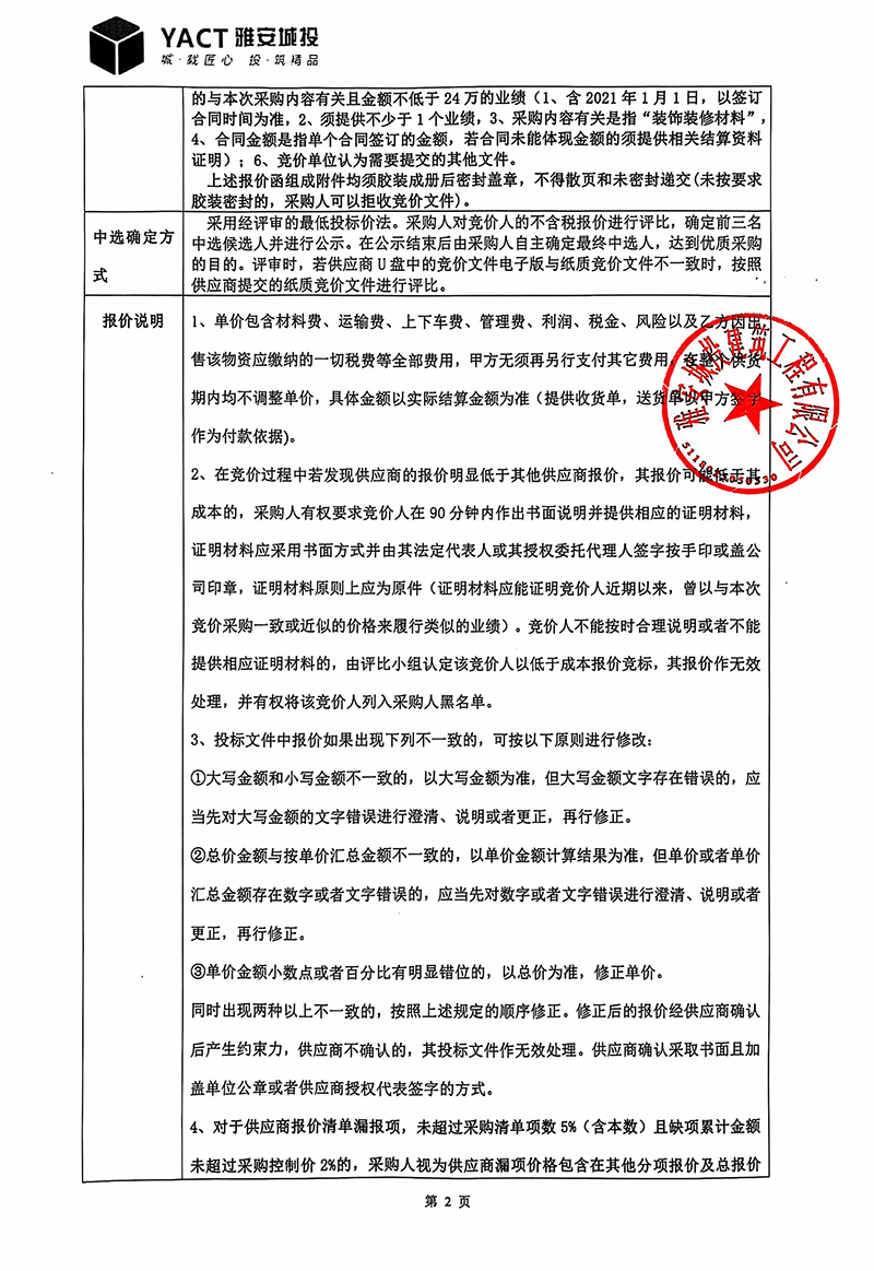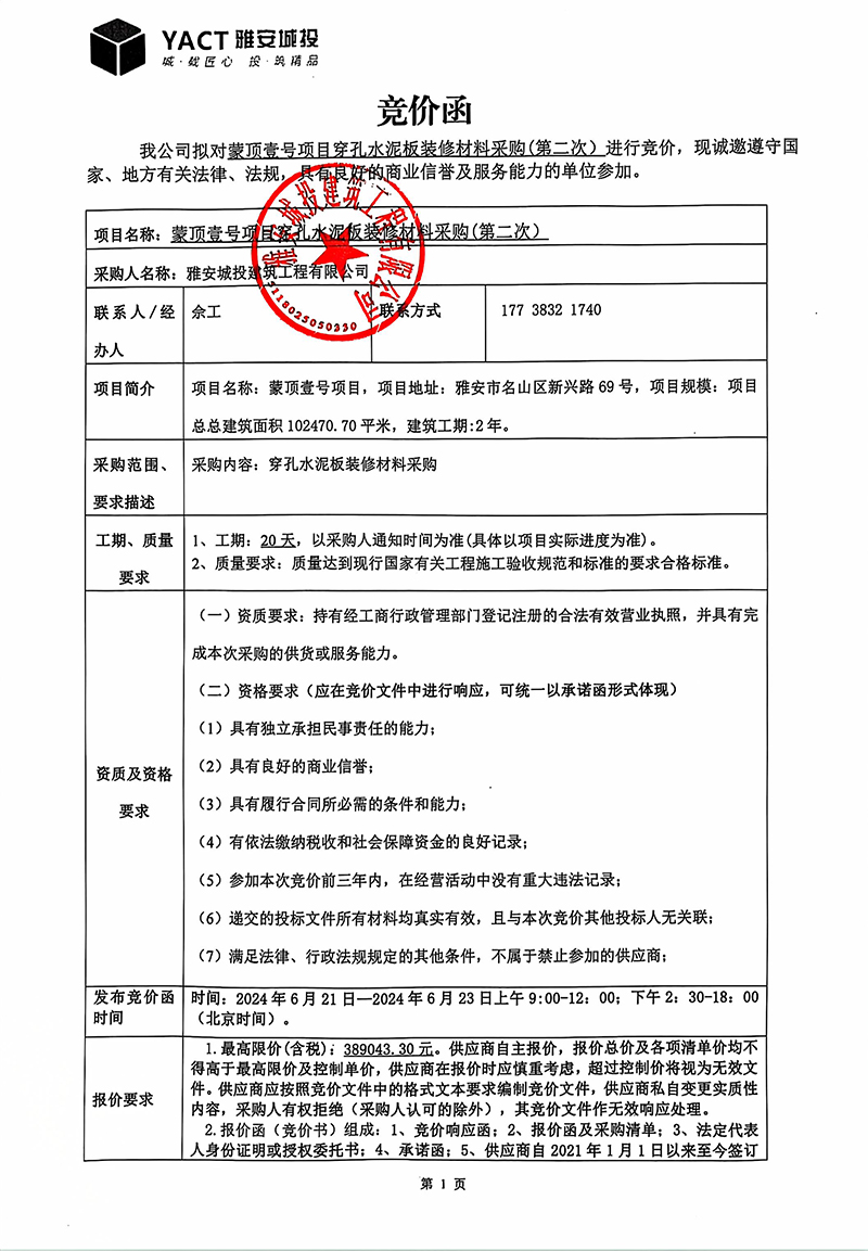 蒙頂壹號項目穿孔水泥板裝修材料采購(第二次)競價函