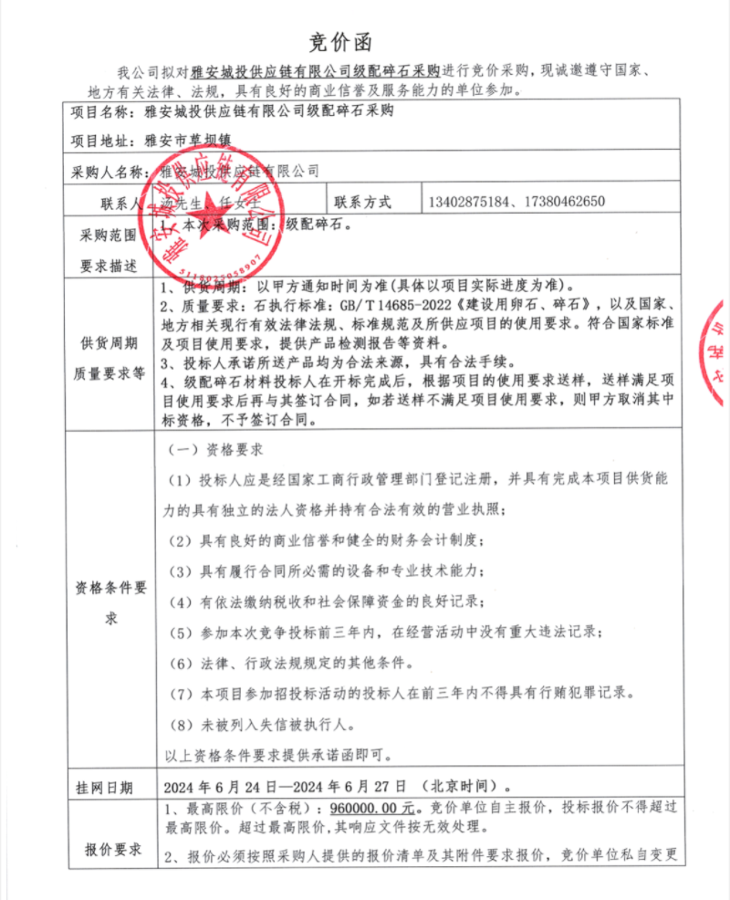 雅安城投供應(yīng)鏈有限公司級(jí)配碎石采購競(jìng)價(jià)公告