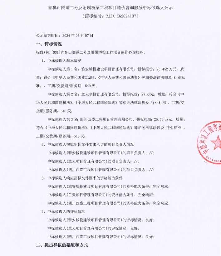 青鼻山隧道二號及附屬橋梁工程項目造價咨詢服務(wù)中標候選人公示