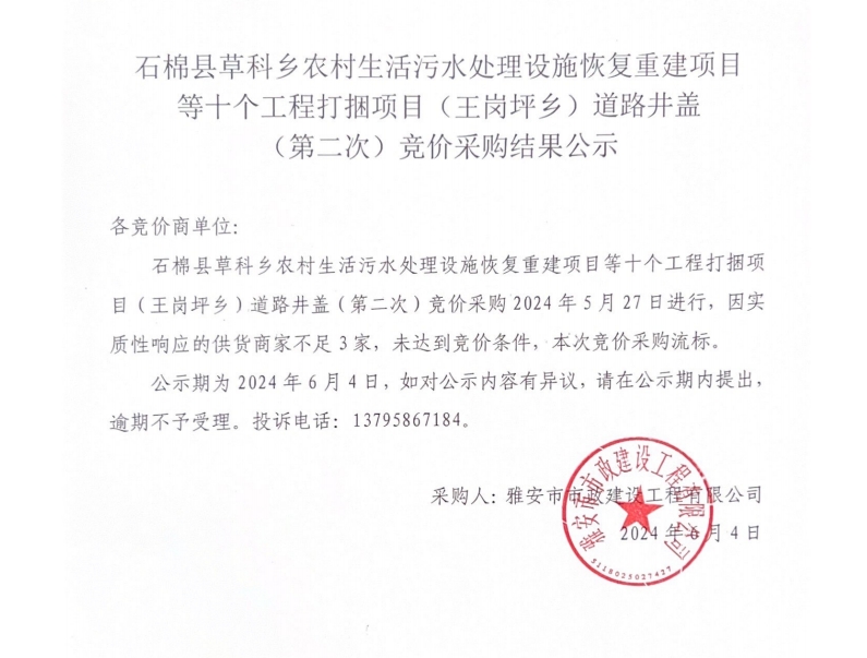 石棉縣草科鄉(xiāng)農(nóng)村生活污水處理設(shè)施恢復(fù)重建項目等十個工程打捆項目(王崗坪鄉(xiāng))道路井蓋(第二次)競價采購結(jié)果公示