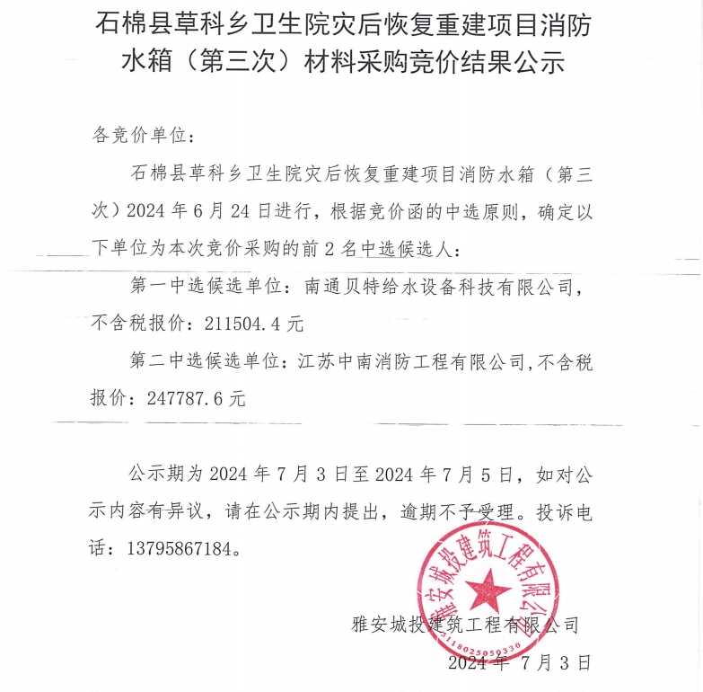 石棉縣草科鄉(xiāng)衛(wèi)生院災后恢復重建項目消防水箱(第三次)材料采購競價結(jié)果公示