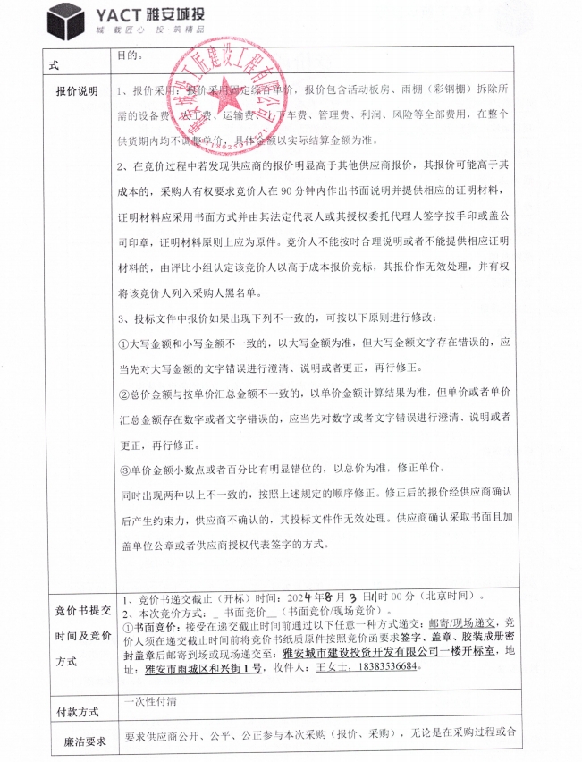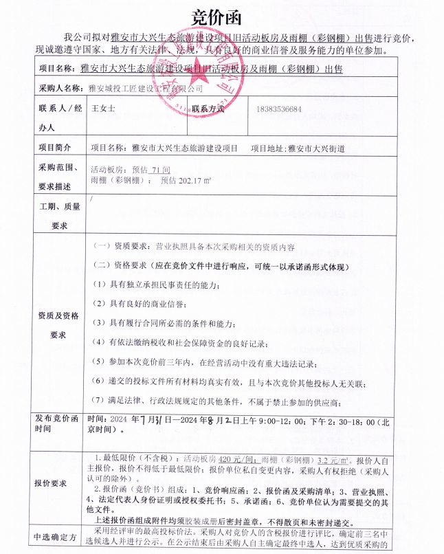 雅安市大興生態(tài)旅游建設(shè)項目舊活動板房出售競價函