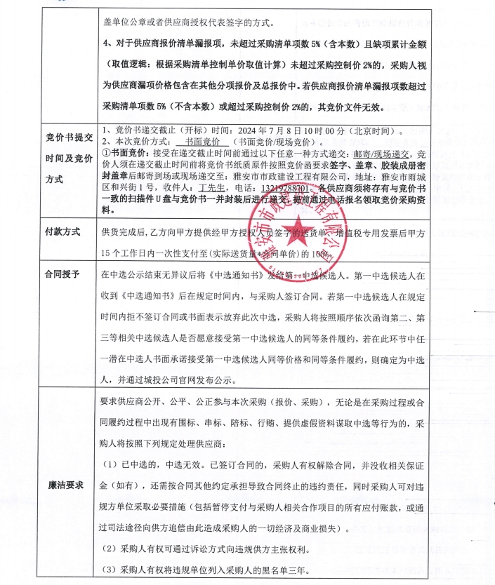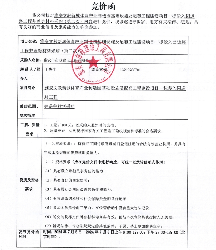 雅安文教新城體育產(chǎn)業(yè)制造園基礎(chǔ)設(shè)施及配套工程建設(shè)項(xiàng)目一標(biāo)段入園道路工程井蓋等材料采購(第二次)競價(jià)公告