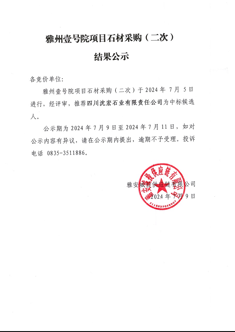 雅州壹號(hào)院項(xiàng)目石材采購(gòu)(二次)結(jié)果公示