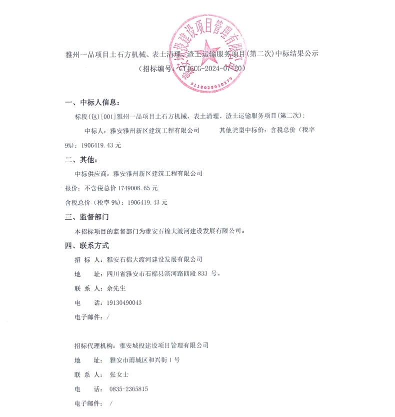 雅州一品項目土石方機械、表土清理、渣土運輸服務項目(第二次)中標結果公示
