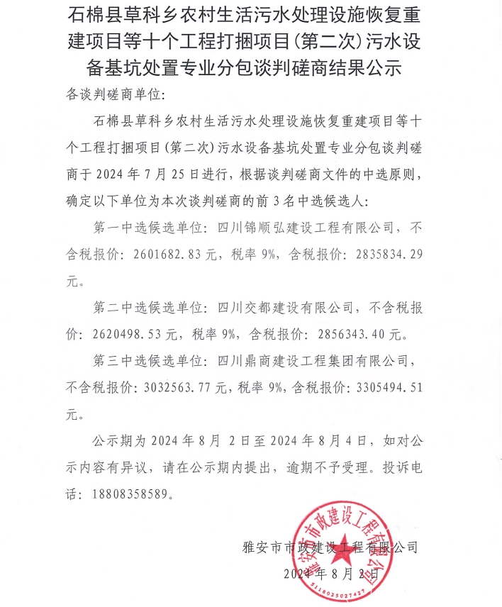 石棉縣草科鄉(xiāng)農(nóng)村生活污水處理設(shè)施恢復(fù)重建項(xiàng)目等十個工程打捆項(xiàng)目(第二次) 污水設(shè)備基坑處置專業(yè)分包談判磋商結(jié)果公示