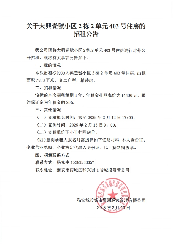 關于大興壹號小區(qū)2棟2單元403號住房的招租公告