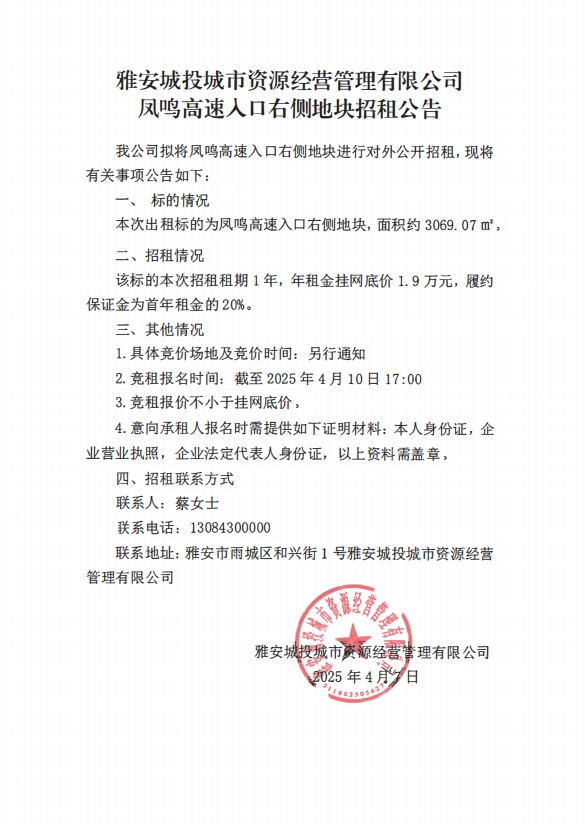 雅安城投城市資源經(jīng)營(yíng)管理有限公司鳳鳴高速入口右側(cè)地塊招租公告