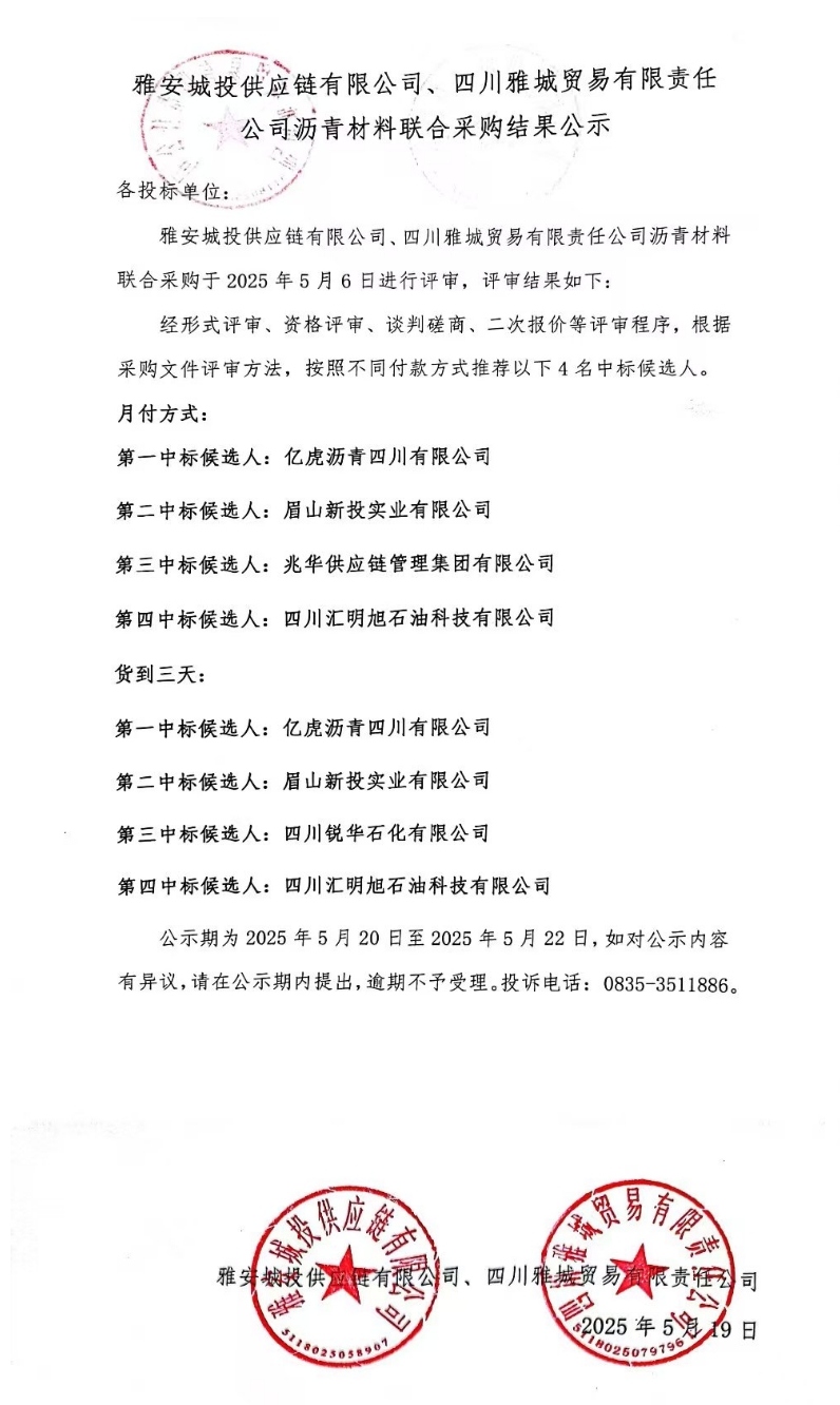 雅安城投供應鏈有限公司、四川雅城貿易有限責任公司瀝青材料聯(lián)合采購結果公示