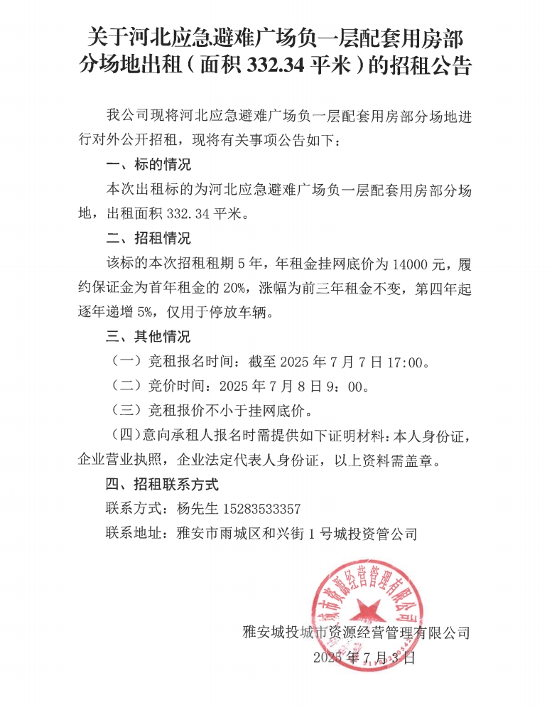 關(guān)于河北應急避難廣場負一層配套用房部分場地出租(面積332.34平米)的招租公告
