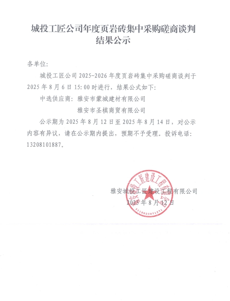 城投工匠年度頁巖磚集中采購磋商談判結果公示