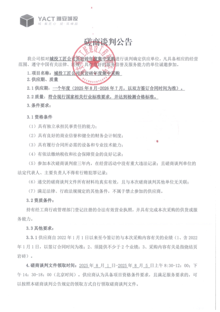 城投工匠公司頁(yè)巖磚年度集中采購(gòu)磋商談判公告