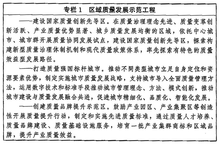 (九)打造區(qū)域質量發(fā)展新優(yōu)勢。加強質量政策引導,推動區(qū)域質量發(fā)展與生產(chǎn)力布局、區(qū)位優(yōu)勢、環(huán)境承載能力及社會發(fā)展需求對接融合。推動東部地區(qū)發(fā)揮質量變革創(chuàng)新的引領帶動作用,增強質量競爭新優(yōu)勢,實現(xiàn)整體質量提升。引導中西部地區(qū)因地制宜發(fā)展特色產(chǎn)業(yè),促進區(qū)域內支柱產(chǎn)業(yè)質量升級,培育形成質量發(fā)展比較優(yōu)勢。推動東北地區(qū)優(yōu)化質量發(fā)展環(huán)境,加快新舊動能轉換,促進產(chǎn)業(yè)改造升級和質量振興。健全區(qū)域質量合作互助機制,推動區(qū)域質量協(xié)同發(fā)展。深化質量強省建設,推動質量強市、質量強業(yè)向縱深發(fā)展,打造質量強國建設標桿。